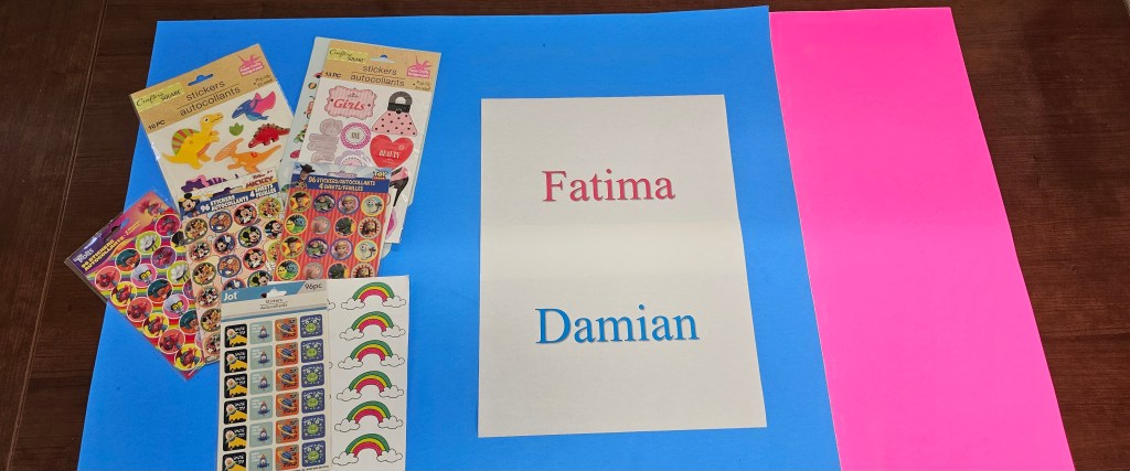 I spent about 10 dollars in total and that’s only because our Dollar Tree is $1.25 now per item and I chose extra sheets of stickers to add to our collection. The kids love choosing their colored poster board and their stickers from dollar tree. Of course, you can go fancier on the materials but for us this works great.