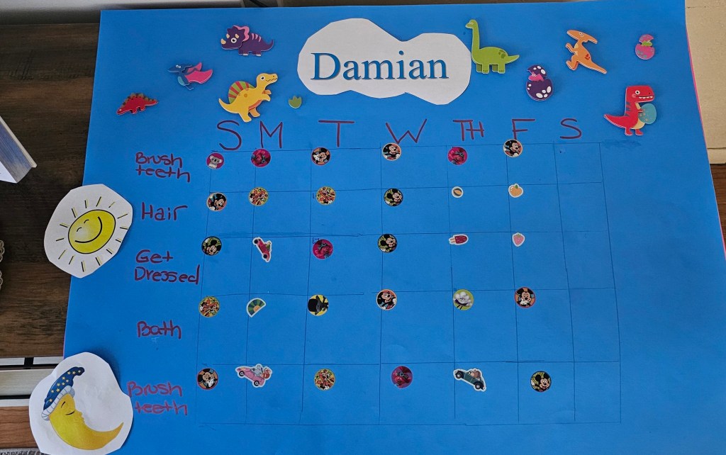 The chart is meant to be simple. The top 3 items on the posterboard are morning tasks and bottom two are night tasks. I have my kids add a sticker to the task they did under whatever day it falls on and they will keep doing that every day for the different weeks! For Fatima, my 8-year-old, I added an extra night task of choosing clothes the next day. It’s ok if the stickers overlap, don’t worry!