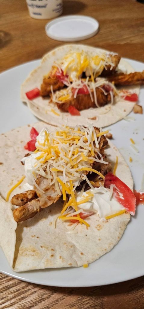 Chicken, bell peppers, add seasoning and cook. Easy steps. Pair with some flour tortillas for some tacos ( I don‘t like corn tortillas but those are great as well), sour cream, cheese, and some salsa( usually from my mother in laws salsa that we stock up on-She makes some of the best salsa). It’s so simple yet so easy.. Make extra and have leftovers for the lunch the next day. Fast and easy to make. I add to Bowls the next day if I want to avoid the tortillas.