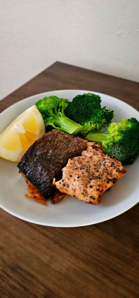 My kids love salmon, and I am here for it. I absolutely LOVE salmon, I could have salmon every day for breakfast, lunch, and dinner. My favorite go-to salmon makes our meal a little pricier than other nights at about 55 dollars for just the salmon for a night’s worth, but it is AMAZING and worth it. I get ours from our local California Fresh Market, which has become my favorite store to get meat at. It is fresh, it is flavorful, and everyone gets a big piece, and nothing is wasted. I can throw it in the air fryer seasoned with pepper, salt, lemon, and butter, and it will be everyone’s favorite. While it is cooking, I steam some broccoli or make some mashed potatoes, and it’s done.
