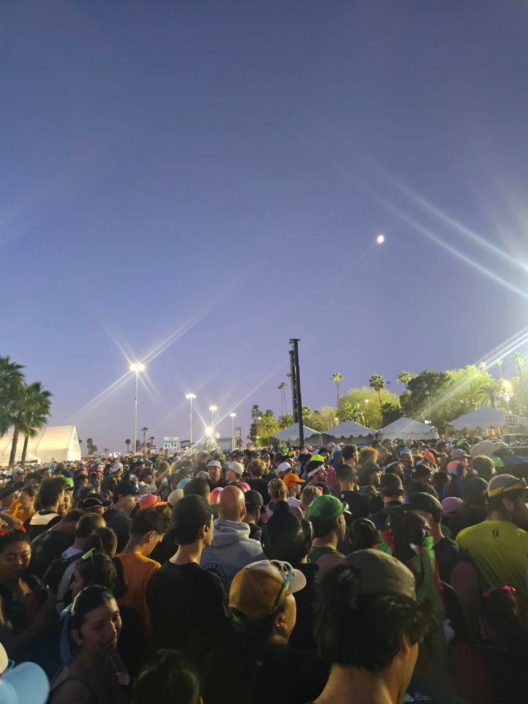We checked out of our hotel at 3:30 am, and drove over to the participant parking that was about 7 minutes away. We walked about 5 minutes to the shuttle buses, which was so convenient and easy for us runners to get to our starting point. We had a smoother pick up compared to last year’s. This year, when we arrived there were no lines, so we literally hopped on the bus right away vs. last year when we were waiting in a very long line for a bus. Within 15 minutes, we had made our arrival at Dodgers Stadium. We had time to use the restrooms without a long line, grab snacks, water, and electrolytes from the snack table. We got there so early that we had a couple of hours to hang out before the start time. I met up with my running bestie Marissa, got to chat with her, stretch, and we actually ran the first miles together, which made me so happy!