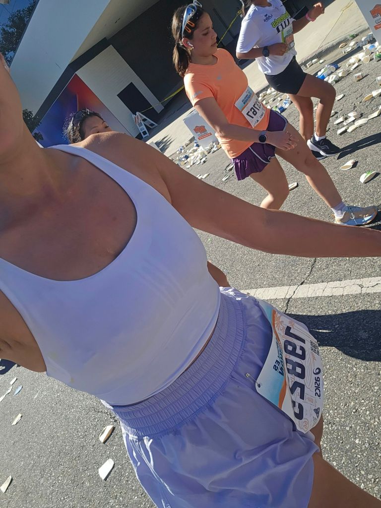 This year, we did Expo day a little differently. It was a HOT day in Los Angeles, and we were hungry and tired, so we didn’t do a full walk through like last year. We checked in and grabbed our bib, our LA Loyal Pin ( we start earning seniority status at the second year), got our finisher shirt, and made our way through to the exit side. Expo day is known for having lots of fun booths with different freebies and chances to purchase different running gear and accessories from different brands, official LA Marathon merch, and lots of fun activities to join in on. Our drive to LA was long, so we opted to only visit the gel booth. We purchased a couple of our favorite ones before heading for some yummy lunch.